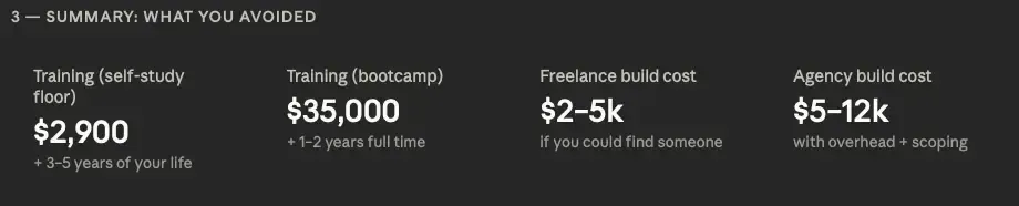 A consulting agency adds discovery phases, project management overhead, and blended hourly rates of $150 to $250. Scoping alone adds four to eight hours before a single line of code is written. Total agency project cost: $5,000 to $12,000.