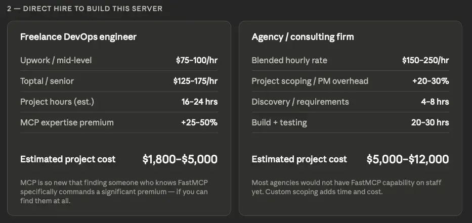 A mid-level freelance DevOps engineer on a platform like Upwork runs $75 to $100 per hour. A senior engineer through a platform like Toptal runs $125 to $175. The project itself would take a knowledgeable engineer 16 to 24 hours — but that estimate does not account for a significant wrinkle: FastMCP is so new that almost no one has hands-on experience with it. That expertise gap commands a 25 to 50 percent premium on top of standard rates, assuming you can find someone at all.
