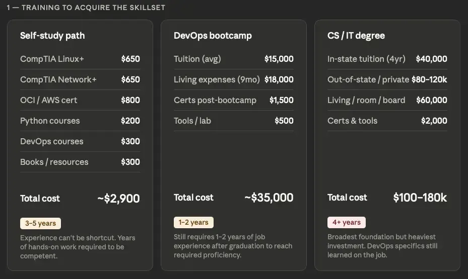 A DevOps bootcamp compresses some of that timeline, but the real cost balloons to around $35,000 once you account for tuition and living expenses — and you still need one to two years of job experience afterward before someone could execute a project like this confidently.